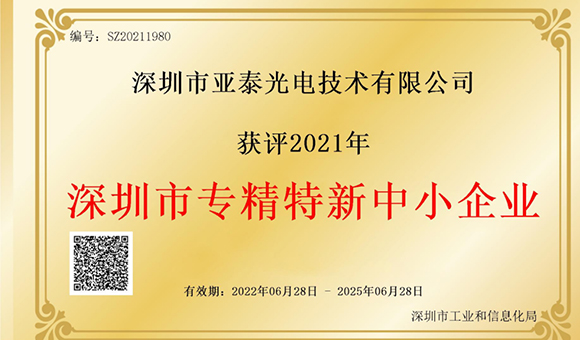 喜訊|深圳亞泰光電獲得深圳市“專精特新”企業(yè)榮譽稱號!