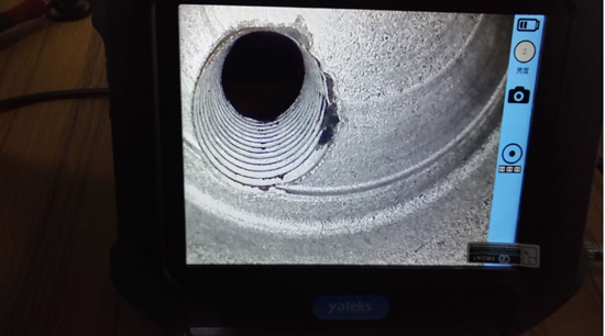 上圖中為亞泰光電SIE超清系列視頻內(nèi)窺鏡在金豐汽配廠(chǎng)檢查排氣管的實(shí)拍圖,很明顯的可以看出該排氣管壁存在微小的焊接漏洞.