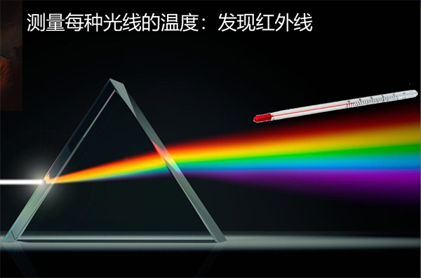 1800年英國科學(xué)家Willian Herschel(1738-1822)發(fā)現(xiàn)紅外線和紅外能,迄今220周年。 他用三棱鏡將太陽光分開,在各種不同顏色的色帶上放置了溫度計, 試圖測量各種顏色的光的加熱效應(yīng)。 結(jié)果發(fā)現(xiàn), 位于紅外側(cè)的那支溫度計溫度上升最快。 為此, 他得出結(jié)論, 太陽光譜中, 紅光的外側(cè)必定存在看不見的光線, 這就是紅外線, 其波長范圍在0.75-1000um.