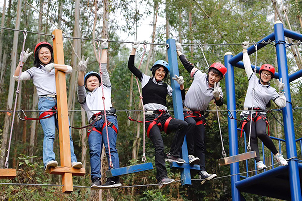 野炊結束午間休息后,年會進入到下半場,下午兩點開始,所有隊員在教練的指導下抖擻精神、重新整裝再出發,開始叢林穿越、高空溜索、飛奪瀘定橋等項目,隨著高空溜索、飛奪瀘定橋等項目的展開,各個小組發揮各自的優勢努力完成每一個項目,每個項目的進行和完成極大的鍛煉了團隊成員的堅強意志、增強了大家的團隊凝聚力和整體向心力,同時每一個人也感受到了團隊合作與溝通的重要性。