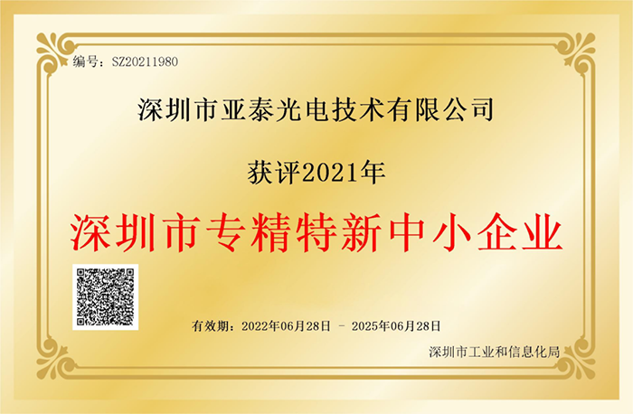 深圳亞泰光電經過五年的披荊斬棘與風雨兼程,憑借著行業的專業性、管理體系的完善性及強大的研發創新能力,獲得了2021年度深圳市“專精特新”中小企業殊榮。