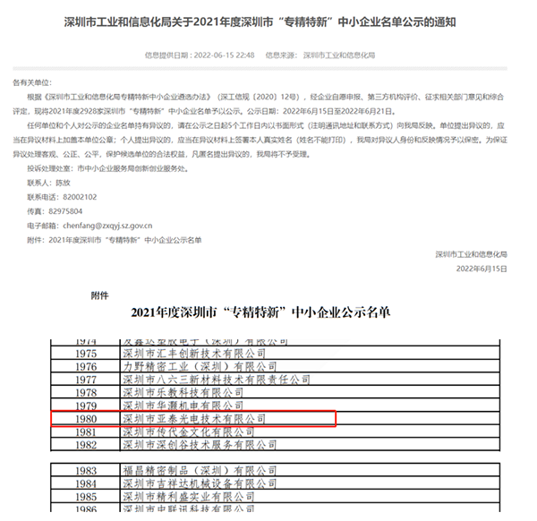 近日,深圳市工業和信息化局發布了《關于2021年度深圳市“專精特新”中小企業名單公示的通知》,深圳市亞泰光電技術有限公司名列榜中。