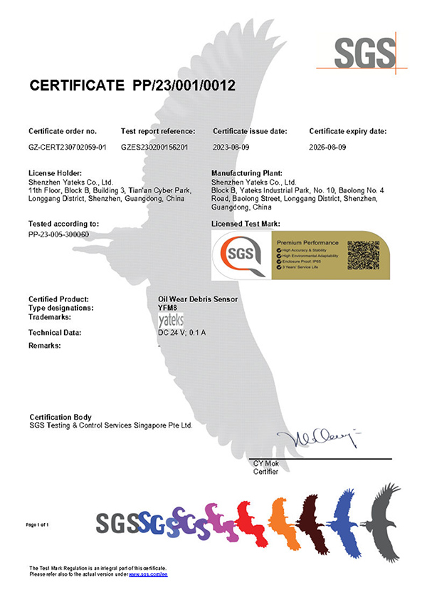 亞泰光電油液金屬磨粒傳感器通過了SGS嚴格的高低溫、濕熱循環、沖擊振動、包裝跌落等環境類測試,以及包括EMC和安全性在內的法規類測試。經測試驗證,傳感器的壽命和功能性符合宣稱,最終取得了SGS頒發的首張傳感器性能認證(Sensor Trust)項目Premium Performance證書。