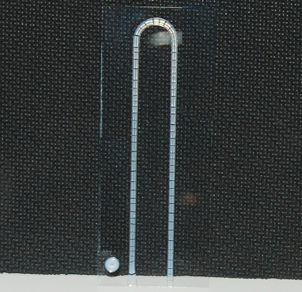 鐵譜片,分析式鐵譜儀耗材,用于油品定性分析——鐵譜分析制譜用。油樣經虹吸泵引導流入鐵譜片,在高梯度磁場作用下,油品中的鐵磁性顆粒會按照規律排布于鐵譜片的U型槽內。