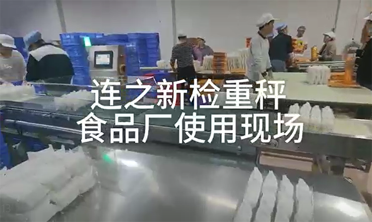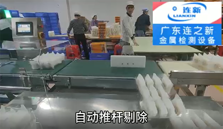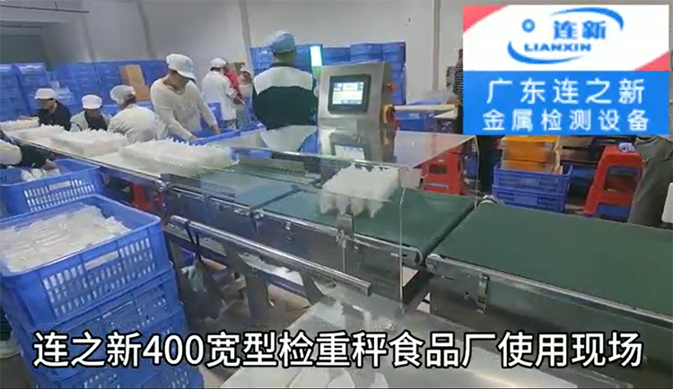 連之新廣東檢重秤/在線重量剔除秤 食品廠使用現(xiàn)場圖片:重量超輕或超重都能自動剔除