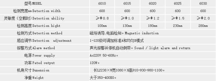 說(shuō)明:檢針機(jī)靈敏度的高低由檢測(cè)高度(即通道或龍門(mén))來(lái)決定最高檢測(cè)精度。龍門(mén)越高,靈敏度就相應(yīng)降低。以上對(duì)應(yīng)的高度和檢測(cè)標(biāo)準(zhǔn)是在空機(jī)狀態(tài)下的檢測(cè)結(jié)果;檢測(cè)通道高度和寬度,都可以按要求定做!