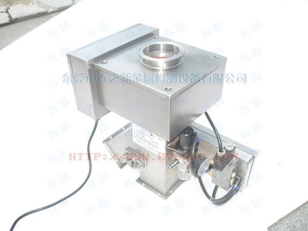 原料從料斗或送料器自由下落進入金屬分離器,如果沒有金屬雜質(zhì),原料會直接通過金屬分離器流向下端的出料口。如果檢測器檢測到原料中含有金屬,那么控制器立刻啟動分離板將金屬物和部分原料一起導(dǎo)向側(cè)面的排料口,然后分流板迅速恢復(fù)至正常的位置,分流板速度可調(diào),金屬分離器的檢測精度也可根據(jù)生產(chǎn)需要調(diào)節(jié),最小可檢測并分離出Φ 0.2mm的金屬顆粒。